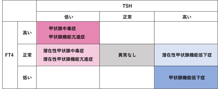 FT4やFT3が正常値より高ければ「甲状腺中毒症・甲状腺機能亢進症」、低ければ「甲状腺機能低下症」と診断されます。