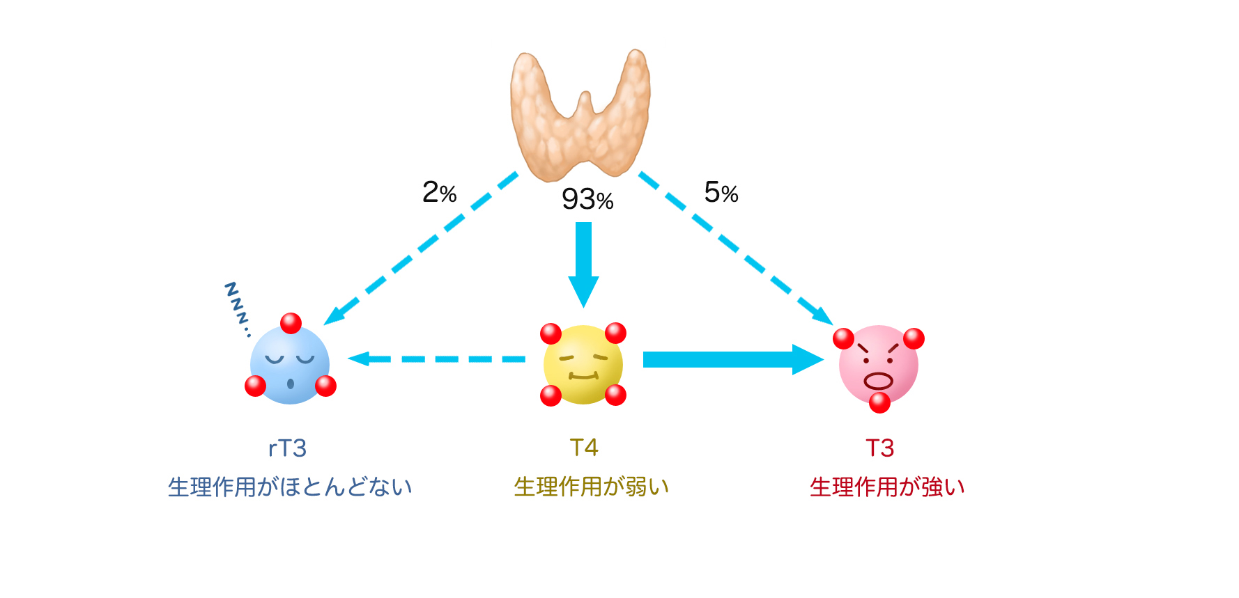 甲状腺ホルモンとしての作用は、T3がT4と比べて10倍ほど強力で、rT3にはほとんどありません。