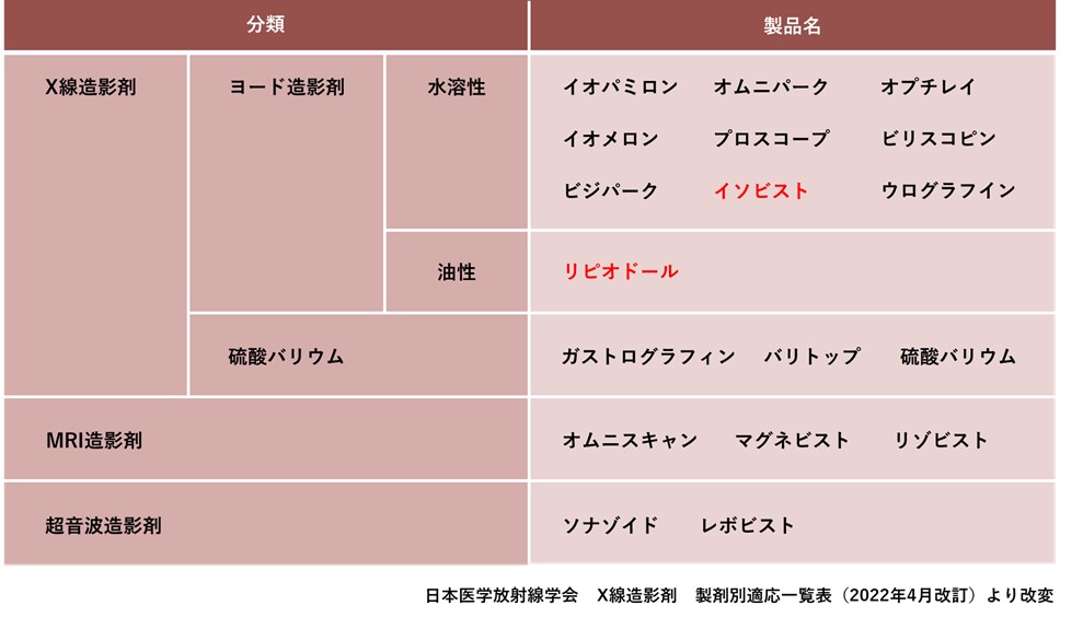 近年は安全性の観点から「水溶性ヨード造影剤(イソビスト)」が用いられることが多くなりましたが、油性にも利点があり、「油性ヨード造影剤(リピオドール)」が使用されることもあります。