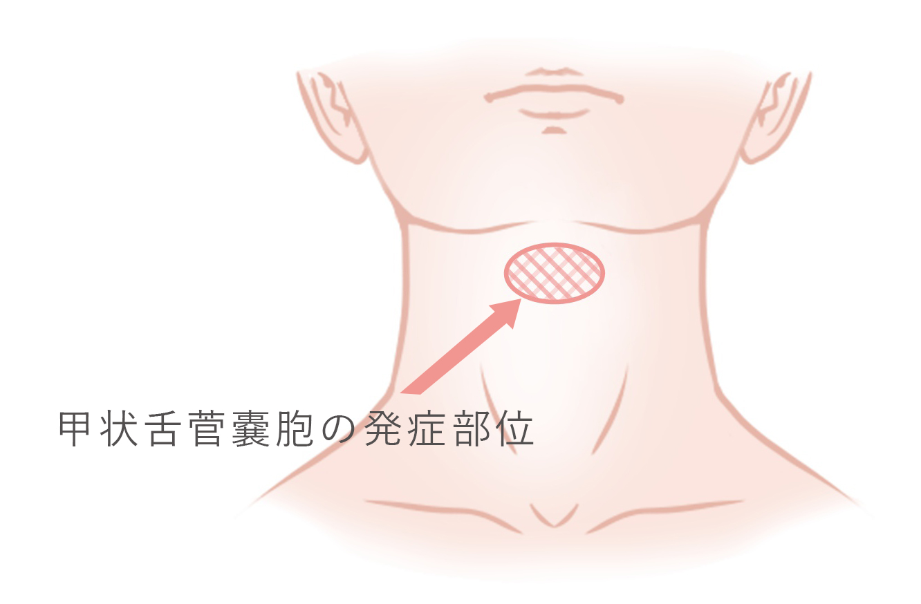 この通り道に「甲状舌管」という細い管が一時的に作られ、出生までに通常は閉鎖しますが、これが出生後も残存することで甲状舌管嚢胞(正中頚嚢胞)が発症します。